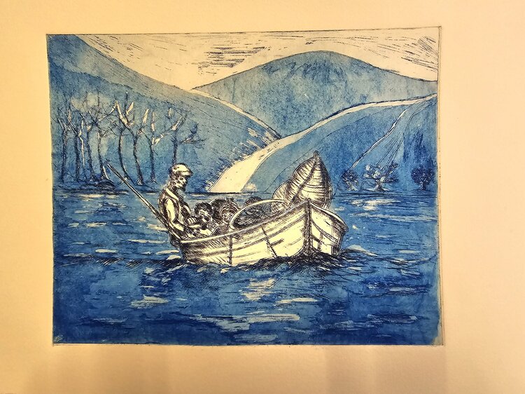 Dans cette gravure, j'ai capturé l'ambiance calme, presque méditative, d'une excursion en bateau partagée sur un lac en Ouganda. L'eau sans fin et les collines calmes et spacieuses créent une scène de réflexion et d'introspection. Le choix des tons bleus renforce le sentiment de calme et d'isolement, tandis que le contraste avec le ciel symbolise un espoir d'espace et de liberté.