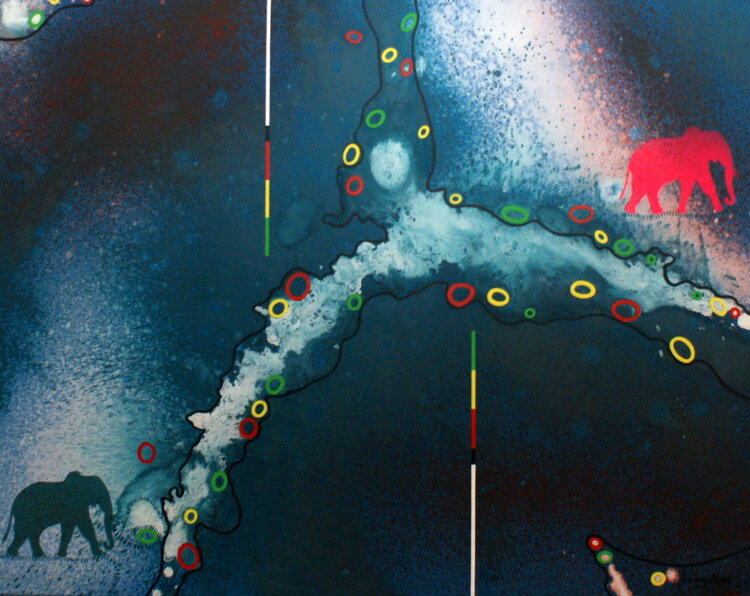 Dans cette œuvre, j'ai plongé dans un univers semi-abstrait où la vitalité des couleurs acryliques fusionne avec la douceur de la nature. J’ai voulu capturer l'esprit sauvage et libre à travers les silhouettes majestueuses des éléphants, véritables gardiens d'un monde onirique. Les teintes nocturnes se mêlent aux éclats lumineux, invitant à l'évasion. Cette création instillera une énergie vibrante et une touche mystérieuse dans tout espace.