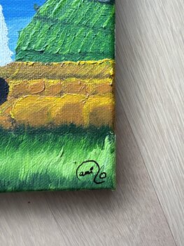Ce tableau-ci représente mon animal préféré, le chat. J’ai voulu symboliser leur douceur devant certainement un magnifique paysage caché par un muret. Paysage inspiré par la région du lavaux en Suisse avec ses vignobles.