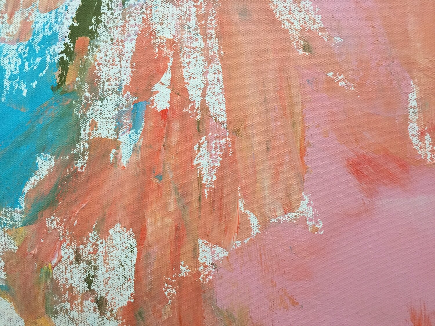 "Go for it 2" est une oeuvre d'art dans la tradition de l'informel abstrait. Les couleurs principales sont l'orange, le rose, le turquoise et un peu de vert foncé et de rouge.
