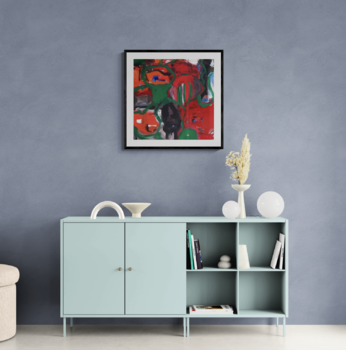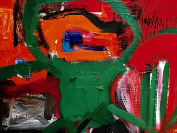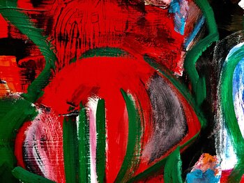 Cette peinture acrylique abstraite est très vibrante. Elle nous raconte une histoire d'espoir, d'amour et d'étreinte. Les couleurs principales sont le vert, le rouge, le noir, le blanc et un peu de bleu.
