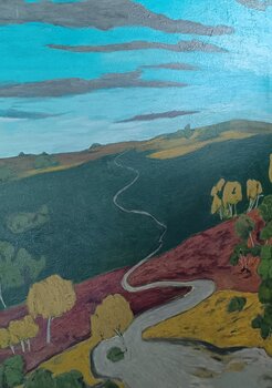 Dans cette œuvre, j'ai capturé la beauté paisible d'un chemin au crépuscule à l'aide de peinture acrylique. Les couleurs vibrantes et les formes fluides reflètent les impressions d'un moment de calme où la nature s'apaise.