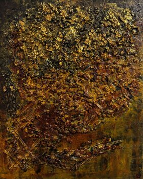 Construite sur toile avec des matériaux de récupération — notamment des éléments adhésifs,… des sphères de polystyrène et des plastiques décoratifs mis au rebut — puis recouverte d'acrylique, la surface reflète une manière enfantine d'appréhender le monde : ludique, curieuse, instinctive et libre.