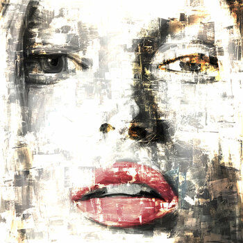 Whiteface Red Lips, c'est le titre de cette œuvre. Le contraste entre ces couleurs impressionne par sa vivacité. Le détail expressif du visage donne au spectateur l'impression que la personne regarde dans la pièce à partir de l'image. L'image est à moitié analogique et à moitié peinte numériquement, puis combinée numériquement sur toile, montée sur un cadre de civière de 4 cm d'épaisseur et une croix en bois stable au dos, enfin finie avec de la… peinture acrylique. Étapes/méthode de travail : analogique, numérique, analogique. Unique.