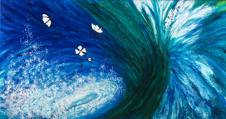 Sur la lèvre de la vague… écume immaculée… et lorsque la lèvre se referme, la vague ultime vient se briser en un jaillissement blanc d’écume, sur le sable doré… L’océan manifeste le mystère de son énergie sans cesse renouvelée, dont l’origine nous est cachée, l’origine… de l’énergie de vie… On sent cette énergie, comme un « courant » qui nous traverse… que nous pouvons capter et nous mettre au diapason, en harmonie… Ma vie est comme une vague de l’océan, un espace temps, matière, lumière, légère, vivante, temporelle, dans l’Intemporel… : l’infini…