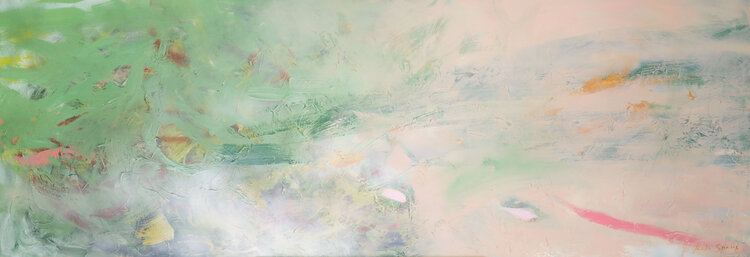 Dans cette œuvre panoramique grand format, je me suis éloigné de l'eau pour explorer l'énergie rythmique des prairies suisses. Cette peinture est un hommage abstrait aux prairies du plateau suisse au cœur du printemps.