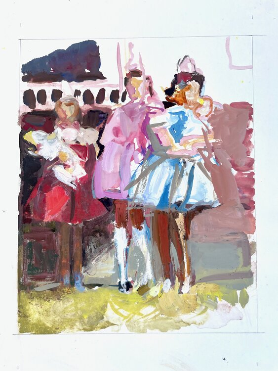 Les formes figuratives dansent au rythme de coups de pinceau vifs, invitant le spectateur à ressentir l'atmosphère joyeuse et l'impatience que je souhaitais partager. Cette œuvre allie la rigueur de la peinture à l'huile traditionnelle à une spontanéité moderne et esquissée, capturant l'essence d'un souvenir avant qu'il ne s'efface.