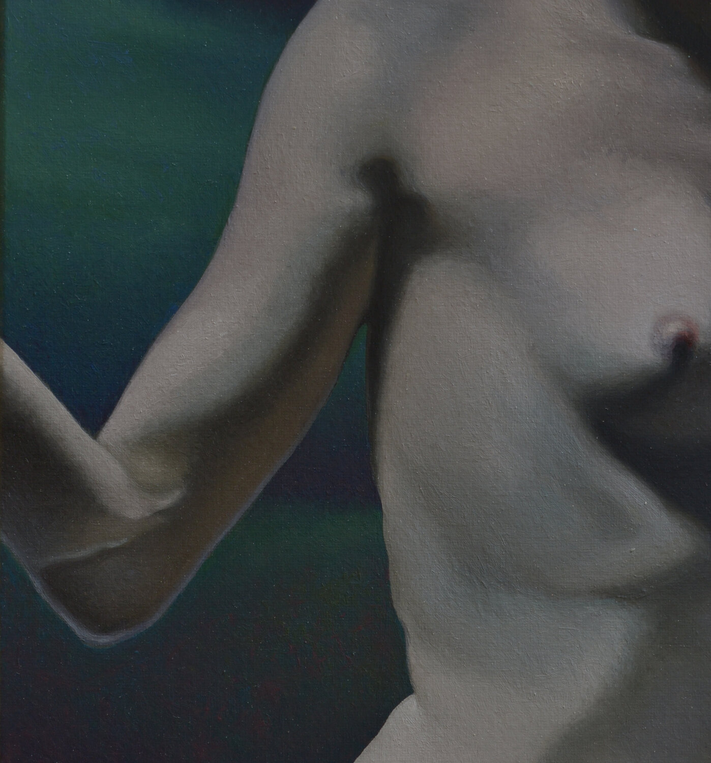 L'énigmatique figure féminine au centre de l'œuvre, peut-être une muse, est saisie dans un moment d'intimité. Un sourire illumine son visage, comme si elle savourait sa propre beauté. Mais sa posture semble exprimer une déception face à un trouble qui a perturbé sa tranquillité. Le soir qui approche instaure une atmosphère de mélancolie.