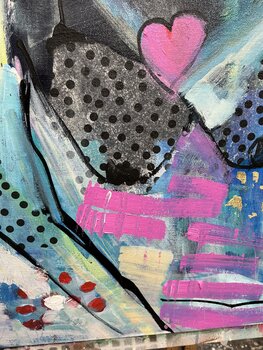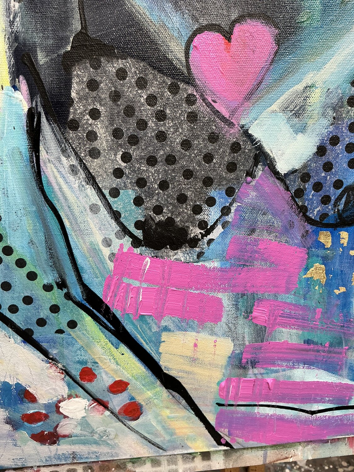 Mon tableau, *Sister*, capture ce lien : la beauté, la… perte et l'amour qui perdure. Les pois représentent les millions de secrets que nous partageons, l'or symbolise nos moments d'or et les lignes en gras reflètent les difficultés que nous avons affrontées ensemble. C'est un rappel qu'il faut chérir ces liens, car l'amour qu'ils font vivre perdure, même lorsque nous sommes séparés par la perte ou la distance.