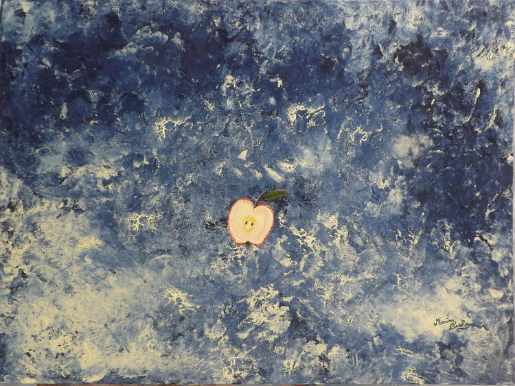 Dans ce tableau, la pomme est coupée en deux, symbolisant le partage de la culpabilité entre les deux personnes qui l'ont goûtée.