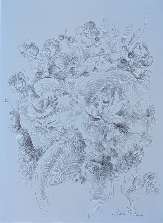 Par des lignes fines et des nuances délicates, j'ai fusionné la vulnérabilité et la beauté de la nature avec la condition humaine. Les fleurs complexes qui éclosent du visage symbolisent… le lien et la transformation. Cette œuvre apporte à toute pièce une énergie paisible, presque méditative, invitant à la contemplation et à la rêverie. Elle rend hommage à l'équilibre subtil entre réalisme et abstraction.