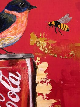 J'ai incorporé des acryliques aux couleurs vibrantes et des feuilles d'or scintillantes à cette œuvre pour fusionner la culture pop du quotidien avec une émotion brute. L'oiseau et l'abeille, perchés sur la canette emblématique, évoquent une énergie vibrante et insufflent une danse vivante entre nature et modernité. Cette œuvre d'art irradie une chaleur dynamique, prête à électriser votre espace de son pouls expressif et vibrant.
