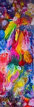 Cette œuvre d'art éblouit par sa profusion de couleurs vives et son dynamisme expressif. La toile est un tourbillon de teintes captivantes où le bleu, le rouge, le jaune et le vert s'entrelacent dans une danse harmonieuse. Les touches épaisses de peinture apportent une texture riche, créant du volume et une profondeur intrigante. Les formes abstraites semblent évoquer des images florales, suggérant une nature en effervescence. L'énergie vibrante… se dégageant de cette composition saisit le regard, chaque coup de pinceau révélant une émotion intense. L'artiste maîtrise admirablement l’art du contraste, utilisant des couleurs chaudes et froides pour créer un équilibre visuel audacieux. Cette œuvre transcende la simple représentation, invitant le spectateur à une exploration sensorielle et émotionnelle profonde, tout en laissant place à l'interprétation personnelle. C’est une pièce fascinante qui célèbre la couleur et le mouvement avec brio.