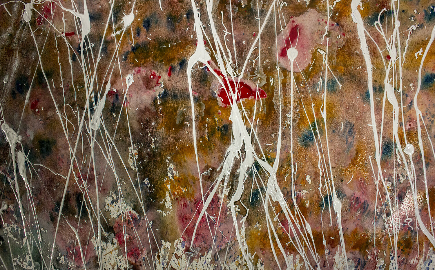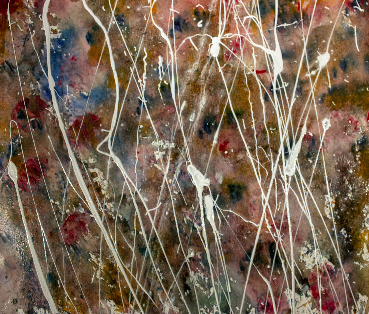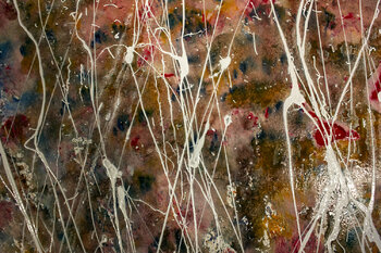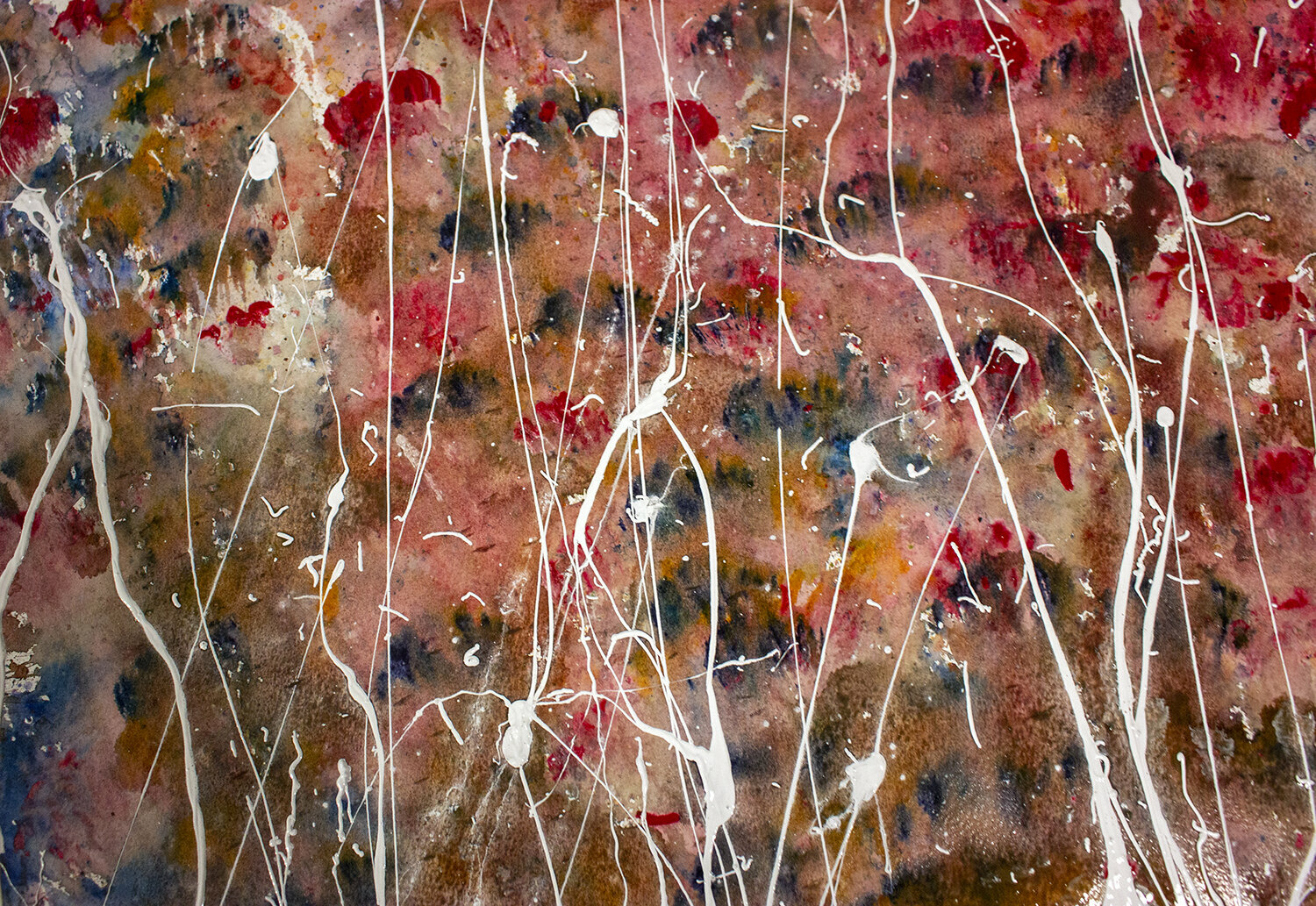 "Fire Field" est une aquarelle accentuée par des touches de peinture acrylique. Au premier plan, on peut observer des filaments blancs complexes s’étendant gracieusement et culminant en points délicats. Pendant ce temps, l’arrière-plan de l’œuvre prend l’apparence d’un champ, marqué par des taches pourpres vibrantes qui évoquent la sensation de feu, ajoutant profondeur et intensité à la composition globale.