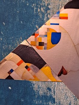 Cet oiseau tangram est composé d'un visage de femme et d'éléments du style Bauhaus. Les pièces sont fixées sur une feuille d'aluminium et collées sur une plaque de gel imprimée au format DIN A4.
