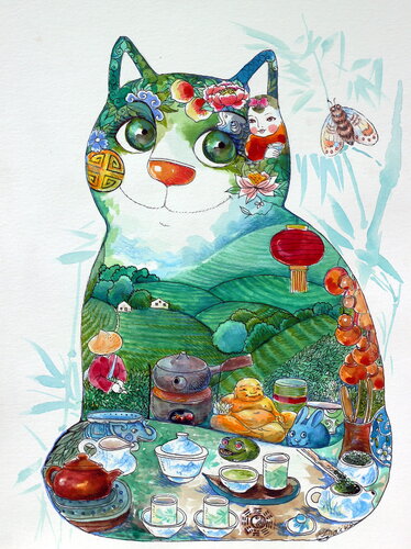 Dans cette œuvre, j'ai harmonisé l'aquarelle, le crayon et l'encre pour capturer une sérénité orientale teintée de naïveté. Si l'on regarde de près, chaque élément, du chat astral aux lanternes, évoque une paix symbolique. L'art fin croise l'art naïf et l'art oriental, convoquant une atmosphère de méditation et de bonheur. Cette création apportera une énergie positive et contemplative à tout espace.