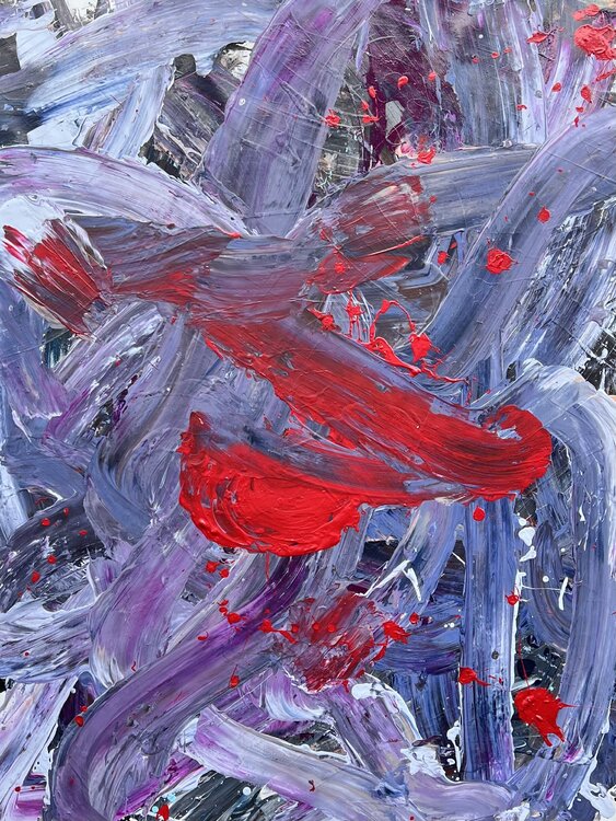 « J'espère que mes peintures vous invitent à suivre les traits, les gouttes et les éclaboussures, ainsi qu'à ressentir l'énergie que j'y mets. »
