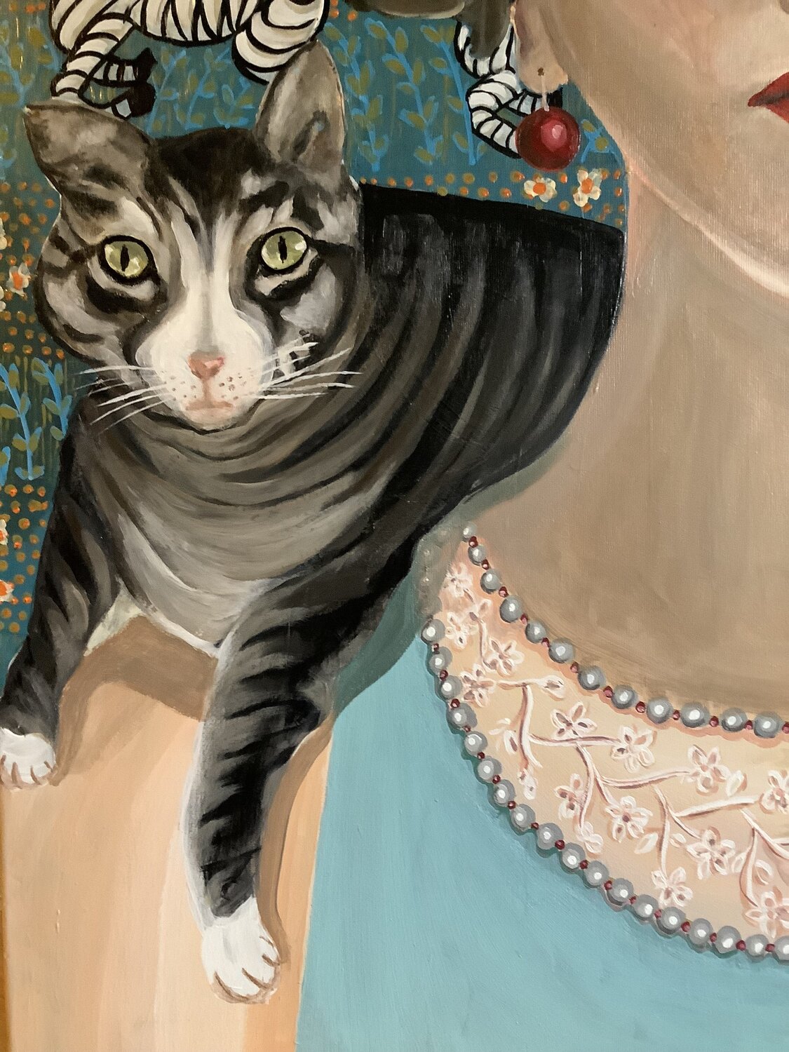 Son meilleur ami, l'inspiration de cette peinture, est une petite histoire d'amour et d'amitié… Les animaux sont généralement ce que je préfère, après ma merveilleuse famille. La loyauté des animaux, leur présence, l'amour inconditionnel qu'ils portent à ceux qu'ils ont choisis… tous nos animaux possèdent ces qualités, mais aucun n'incarne ce comportement avec autant d'éclat que nos chats. Une chatte en particulier, une chatte recueillie, vous remplit… de joie dès qu'elle vous voit. Elle s'enroule autour de votre cou avec une telle habileté et un tel équilibre qu'on peut se déplacer librement sans qu'elle puisse bouger, comme collée à nous. Je suis convaincue que cette peinture trouvera sa place dans n'importe quelle pièce et qu'elle saura vous égayer. Elle n'est pas encadrée, mais prête à être accrochée chez vous.