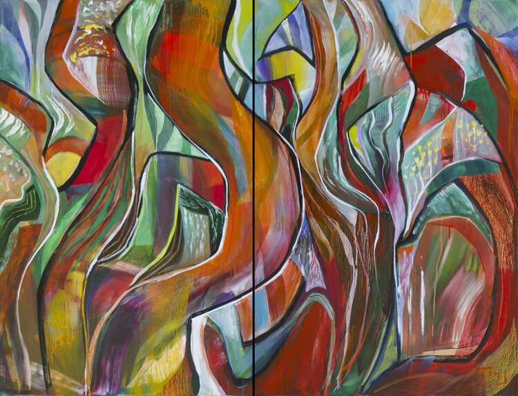 Dans « Snappy Gum Diptych », Tillian évoque la résilience sinueuse du « snappy gum » australien à travers une abstraction vibrante, vibrante de couleurs, de mouvement et de mémoire écologique.… Des ocres riches, des verts émeraude et des rouges terreux évoquent les broussailles de l'intérieur, sujettes aux incendies, tandis que les formes fluides du tableau suggèrent à la fois écorce, flamme et réseaux artériels. Par un travail de pinceau gestuel et des transparences superposées, l'artiste propose non pas une représentation du paysage, mais une rencontre intime avec son animation et sa charge mythique. Faisant référence aux pratiques territoriales autochtones et à l'abstraction d'après-guerre, cette œuvre place la brousse à la fois comme sujet et co-créateur : un champ actif de régénération, d'histoire et de sagesse incarnée.