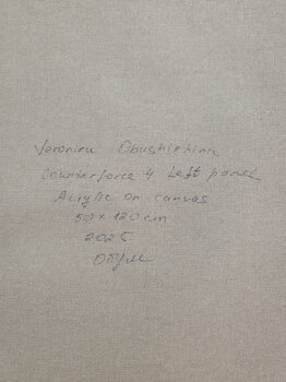 Ce tableau est un diptyque réalisé à l'acrylique sur toile. Chaque panneau mesure 50 × 120 cm et a une épaisseur de… 3 cm. Une fois les deux panneaux réunis, le diptyque mesure 100 × 120 cm. Les bords sont peints en harmonie avec la composition.