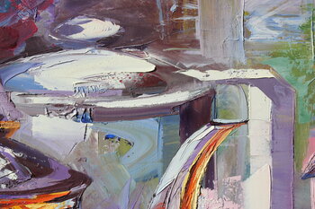 Il dipinto è stato ispirato da una scena di una fiera antiquaria all'aperto. Nell'ambiente vivace e soleggiato, una vertiginosa gamma di colori si riflette sulle superfici lucide. Le superfici curve riflettono l'ambiente in modo distorto, sfidando l'occhio e la mente a interpretare le forme. Interessante contrasto tra la parola "natura morta" e l'attuale scena vibrante.