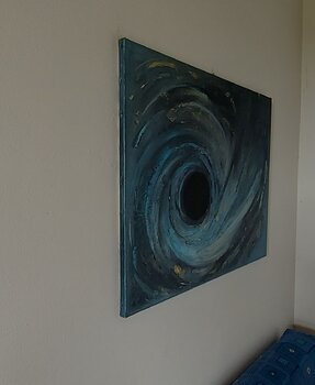 Quest'opera semiastratta è nata da una notizia letta su un sito che tratta argomenti riguardanti l'astronomia, dove si diceva che era stata scoperta una nuova galassia, pertanto la mia creatività si è subito attivata a riguardo creando la tela con gesso, acrilico e glitter.