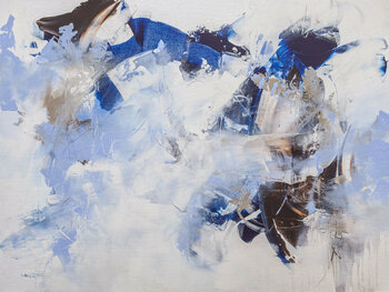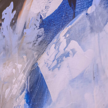 "Improvvisamente" è un'opera d'arte astratta in formato 100x120 cm su una tela di lino di 2 cm di grande qualità (i lati sono rifiniti con colore come il volto del dipinto). L'atmosfera molto espressiva del dipinto è composta da tonalità calde e fredde di blu, beige, marrone e bianco. La composizione libera e moderna dell'opera d'arte si adatta alla maggior parte degli interni domestici e di lavoro.
