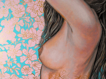 Mi piace realizzare opere che abbiano una composizione equilibrata tra la figura umana e il fondo; in questo caso, come in molte mie opere, il fondo e la figura umana si fondono insieme, creando una relazione pittorica. Tutto il dipinto è concepito per evidenziare il linguazzio pittorico: la modella "appoggiata" alla parte destra del dipinto; la fascia blu in alto, con i fiori di ciliegio… dorati, "pesa" tanto quanto la grande parte sottostante dei fiori di ciliegio in tinta rosa, contrastata dal colore complementare verde-azzurro.