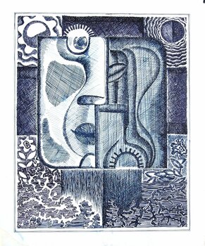 Con penna e inchiostro di china, ho riversato i miei pensieri in quest'opera, fondendo linee e forme intricate per evocare un senso di complessità interiore e trasformazione. Gli elementi figurativi invitano gli spettatori a esplorare la propria percezione di identità e cambiamento. L'opera irradia un'energia dinamica e riflessiva, perfetta per suscitare riflessione e curiosità in qualsiasi spazio in cui si trovi.