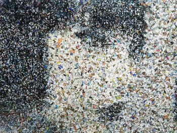 This unique artwork is a acrylic painting on shredded paper on wood.