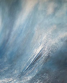 Strati di blu intenso e nero si dispiegano come velluto in movimento, mentre tenui accenti bianchi emergono come raggi di luce che filtrano attraverso la superficie. La texture scultorea eleva l'opera oltre l'aspetto visivo, creando un'esperienza tattile che evoca serenità e forza.