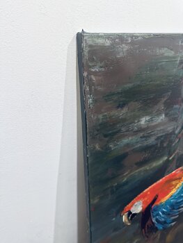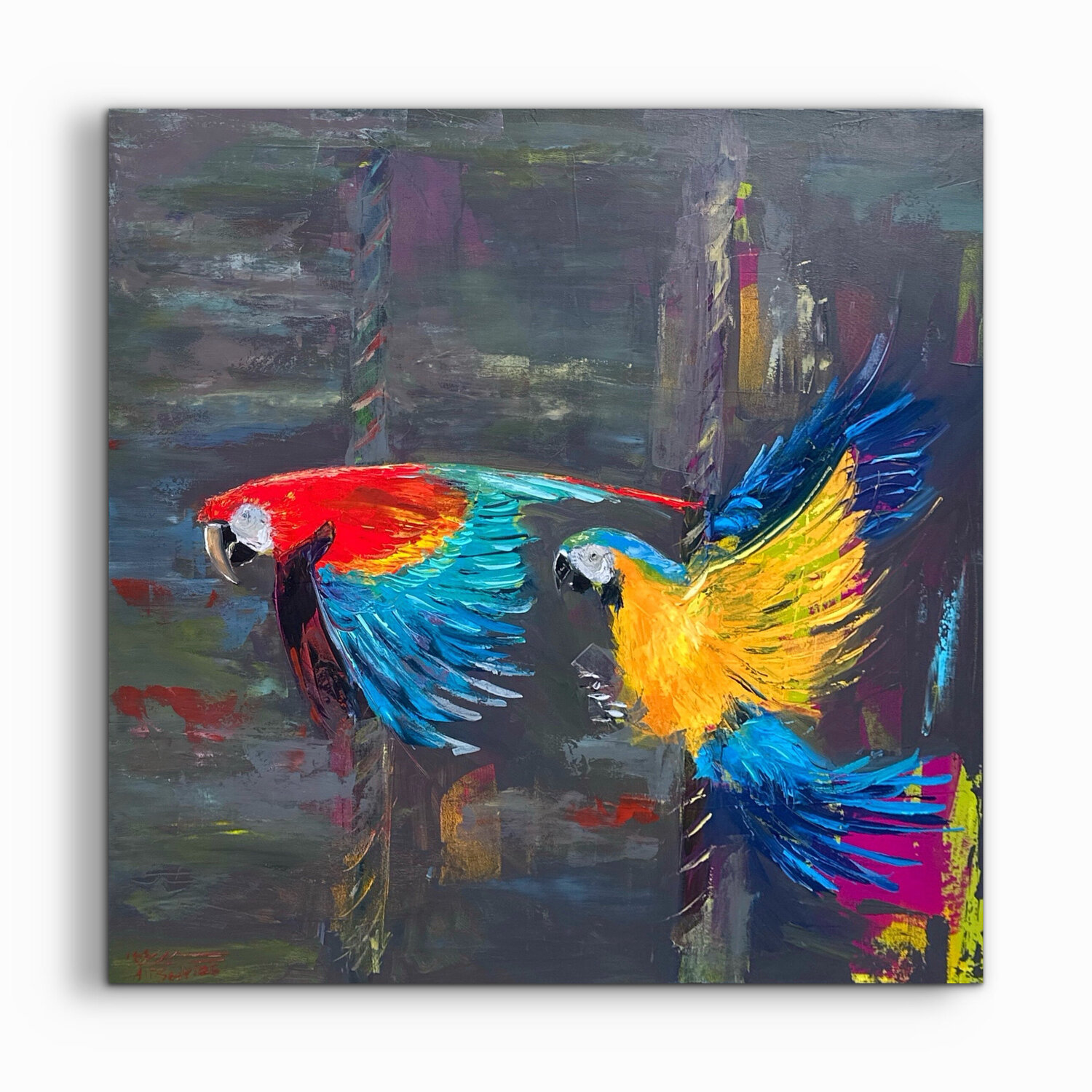 Le texture audaci della cazzuola e le pennellate stratificate enfatizzano la tensione tra dinamismo e limiti. I pali… contorti della giostra trascinano i pappagalli in una danza circolare senza fine: un ciclo di gioia, energia e nostalgia.