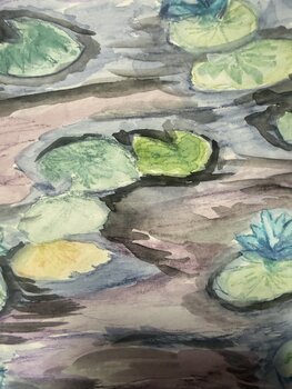 Ninfee - un'opera ad acquerello che ho creato utilizzando blu, verdi e viola per catturare un'atmosfera notturna. Fa parte della mia serie di soggetti naturali realizzati con colori vivaci.