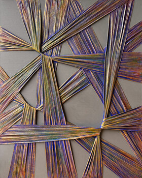 Lavora con tessuti naturali stratificati, come garza, cotone e fibre tessili, dai quali emergono strutture calme e fisicamente tangibili.