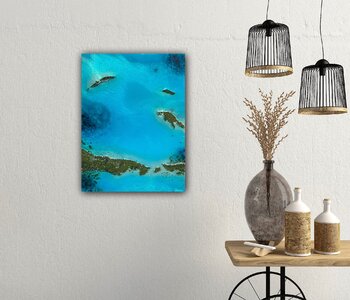 Dipinti unici sull'oceano e sulla spiaggia con sabbia bianca e onde schiumose, ispirati alle immagini satellitari e aeree delle Bahamas