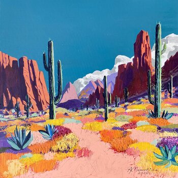 Memory of Warm Winds è un ricordo sensoriale catturato nel colore, nella consistenza e nel movimento. Questo dipinto vi invita in un paesaggio desertico da sogno, dove la brezza calda sembra sussurrare storie, frusciando tra i cactus, accarezzando i fiori illuminati dal sole e lasciando una traccia delicata sulla pelle.