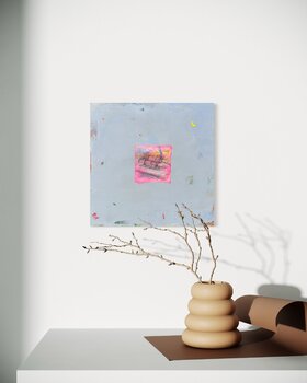 Ho riversato le mie emozioni in quest'opera, fondendo forme astratte e minimalismo, creando uno spazio tranquillo attorno a un punto focale vivido, quasi nostalgico. La cornice rosa acceso che circonda la seduta invita al calore e alla riflessione, in mezzo allo sfondo fresco e soffuso. Cattura la solitudine e i momenti fugaci, evocando un'energia calma che porta pace introspettiva e una sottile vivacità in ogni stanza.