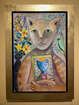 Un'immagine nell'immagine nell'immagine! Questo dipinto parla dell'amore e dell'affetto della famiglia, dei sentimenti che un padre o una madre possono provare per un bambino. Benessere e felicità espressi nel linguaggio del gatto.