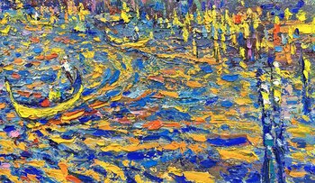 Questo dipinto, intitolato Gentle evening in Venice, ritrae l'iconico Canal Grande al tramonto, che risplende in calde tonalità di oro e viola. La luminosa Santa Maria della Salute si erge maestosa, mentre le gondole scivolano sui riflessi scintillanti e colorati nell'acqua. Utilizzando un impasto espressivo e vivaci pennellate puntiniste, l'artista cattura il fascino romantico e l'allure senza tempo di Venezia. Il dinamico gioco di luci e colori… evoca la tranquillità e la magia di una sera in questa incantevole città. Perfetto per gli amanti della bellezza veneziana e della vivacità artistica.