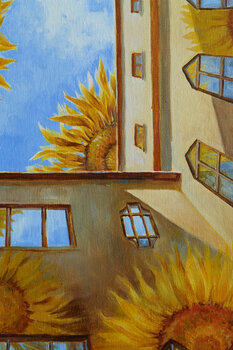 Ho visto questa immagine quando mi sono trovata nel cortile della The German House a Chernivtsi (Ucraina). Era buio e fresco lì nonostante la calda e soleggiata giornata estiva. E solo il cielo azzurro splendeva sopra. Ho visto subito questo cortile illuminato, ma non era illuminato dal sole, nella mia immaginazione era illuminato dai girasoli. E questo dipinto è diventato la continuazione della mia serie Metamorfosi.