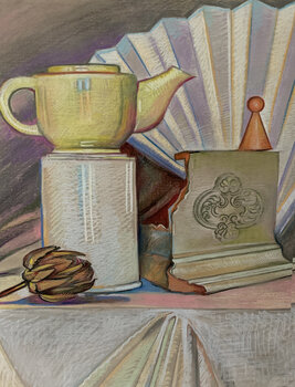Questa natura morta è una meditazione sulla fragilità, l'eleganza e il tempo. Sono stato attratto dal contrasto tra il fragile ventaglio, l'elemento architettonico rotto e il tessuto morbido e fluido. Insieme, raccontano una storia silenziosa, una storia di quiete, memoria ed eleganza nell'imperfezione. La composizione invita gli spettatori a rallentare, osservare i dettagli e riflettere su come le cose più semplici possano avere un peso emotivo.