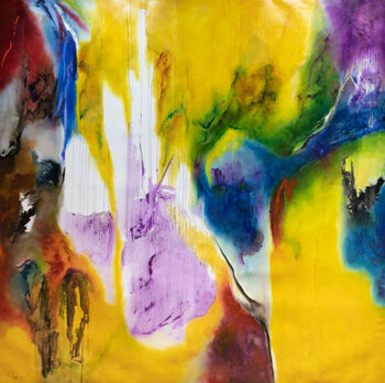 Il giallo, vibrante di luce, invade lo spazio con energia radiosa, mentre i toni più scuri, viola e nero, agiscono con resistenza, ancorandoli alla realtà. È una lotta, certamente una complementarietà, dove gli opposti coesistono.