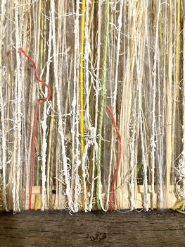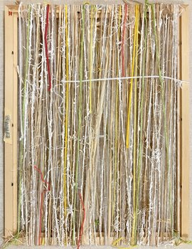 .Qui, la miscela di lana, cotone, paglia e fili mineralizzati ha creato uno spazio di dualità, morbido e ruvido allo stesso tempo, in cui abbiamo più l'impressione che l'aria partecipi alla materia. l'opera è lavorata secondo lo stile dell'art brut, non nascondendo le strutture ma al contrario mettendole chiaramente in evidenza. Il risultato è rustico ma delicato ed elegante.