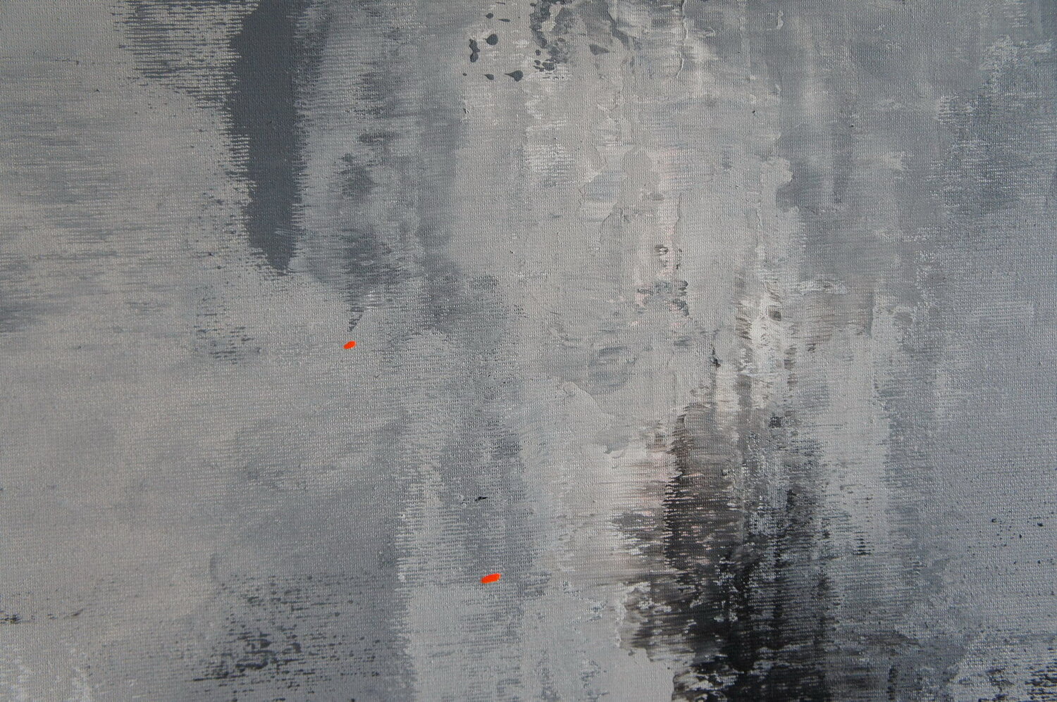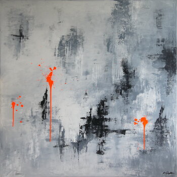 Ecco un'enorme opera quadrata, per lo più nei toni tenui del bianco, del grigio e del nero, con gocce e macchie di arancione neon che danno al dipinto un tocco in più... è un ricordo di un mio vecchio dipinto ("Fargo") e per me un promemoria della longevità e dell'immortalità dell'arte. Buona visione!