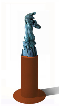 Questa scultura raffigura una figura umana in posizione accovacciata, resa con un linguaggio formale fortemente geometrico e frammentato, che richiama l’estetica del cubismo e del futurismo. Il corpo, scolpito in modo angolare e sfaccettato, è composto da piani intersecanti e volumi prismatici che danno vita a una forma dinamica e potente. Ogni superficie riflette la luce in modo differente, creando un suggestivo gioco di ombre e profondità. La figura… femminile, ha una posa intensa e introspettiva: una mano poggia sulla testa, mentre l'altra si protende all’indietro, quasi a proteggersi e a contenere un’energia interiore e attraversata dal vento. Una metafora della complessità dell’identità umana, della lotta interiore o della trasformazione spirituale.