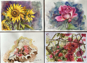 Un affascinante set di 4 opere ad acquarello raffiguranti le meraviglie della natura attraverso buganvillee, rose, girasoli e i minuscoli fiori posti all'interno della conchiglia. Sono stati utilizzati colori delicati e rilassanti di rosa, lilla, rosso e giallo. Si tratta di singole opere d'arte che possono essere montate e incorniciate e disposte insieme o separatamente.