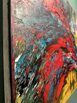 In questo vibrante dipinto a olio, ho cercato di esplorare il crudo sconvolgimento emotivo e la bellezza della rinascita. Utilizzando ampie e drammatiche pennellate di cremisi e blu intenso su uno sfondo dorato, ho catturato un movimento tumultuoso ma edificante, che ricorda una fenice che risorge. È una testimonianza di resilienza e rinnovamento. Questo pezzo porterà una presenza potente e stimolante in qualsiasi spazio, accendendo una stanza con… la sua energia dinamica e i suoi colori intensi.