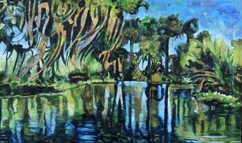 Durante la mia residenza d'artista a New Orleans 2023, ho vissuto a Marigny, vicino al French Quater, volevo assolutamente andare a visitare le paludi della Louisiana, meglio conosciute come Swamps o Bayous. Sono stato invitato all'inaugurazione di una mostra fotografica di James Barbee presso la Galleria Huracan. È così che ho visto per la prima volta le immagini delle Paludi. Mi ha invitato al viaggio nelle paludi. In questo lavoro esploro le profondità… mistiche delle paludi, catturando l'essenza vibrante e selvaggia della natura riflessa nell'acqua scintillante. Usando olio e sabbia, ho strutturato ogni elemento per evocare un'immersione sensoriale totale. Contrasti di colori chiari e scuri respirano una vita energica, invitando lo spettatore a sentire il potere silenzioso di un ambiente naturale incontaminato. Questo dipinto è un omaggio alla bellezza cruda ed enigmatica dei paesaggi acquatici, un ricordo del delicato equilibrio tra uomo e natura.
