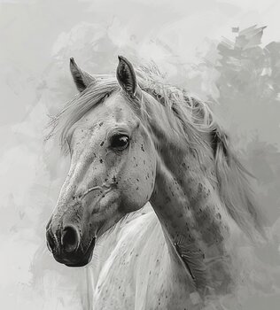 Un sereno cavallo bianco osserva dolcemente dalla tela, il suo mantello splende di una luce argentata e morbida. Le pennellate sottili catturano la grazia e il comportamento calmo del cavallo, evocando un senso di bellezza e compostezza senza tempo