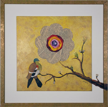 Fondo in cartoncino telato 30 x 30 cm goffrato. Il disegno si estende sulla cornice. Fiore tagliato da un foglio di giornale.